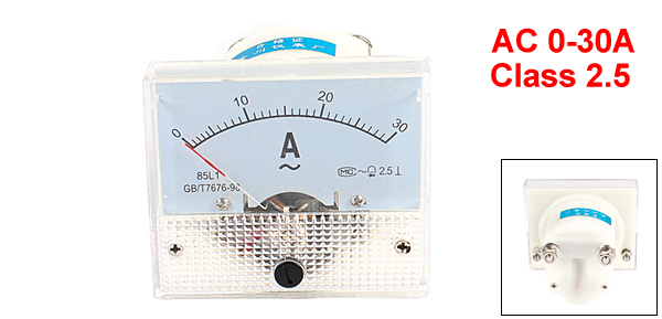 Product Name Ampere Panel Meter Scale Range 0-30A Accuracy Class 2.5 Material Plastic Color White, Clear, Beige Back Screw Dia. 3.8 mm / 0.15" & 2.8 mm / 0.11" Panel Size 6.3 x 5.5 x 1.1 cm / 2.5" x 2.2" x 0.4" (L*W*T) Overall Depth 6 cm / 2.36" Weight 60g Package Content 1 x AC Ampere Panel Meter - Reviews