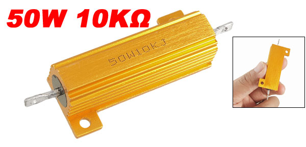 DetailsScrew Tab 10K Ohms 5% 50W Power Aluminum Shell Case Wirewound Resistor  Product Name Aluminium Clad Resistor Power Rating 50W Resistance Value 10000 Ohm Resistance Tolerance ± 5% Mounting Hole Dia. 0.3cm / 0.118" Mounting Hole Spacing 4cm / 1.6" Case Size (Exclude Tabs) 5 x 1.6 x 1.5cm / 2" x 0.63" x 0.59" (L*W*H) Overall Size (Approx.) 7.2 x 2.8cm / 2.8" x 1.1" (L*W) Case Material Aluminum Case Color Gold Tone Net Weight 25g Package Content 1 x Aluminium Clad Resistor