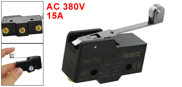 DetailsScrew Terminal Roller Long Lever Hinge Momentary Micro Switch Gwjva  Product Name Micro Switch Model No. TM1703 Action Type Momentary Contact Type 1NO 1 NC Actuator Type Roller Lever Hinge Voltage/ Current Ui: AC 380V, Ith 15A Ue/ Ie AC 250V 1.5A DC 220V 0.3A Switch Body Size(Each) 50x 17 x 30mm/ 2" x 0.67" x 0.12" (L*W*H) Lever Size 40 x 8mm/ 1.6" x 0.32(L*W) Roller Diameter 10mm/ 3.9" Hole Size 4mm/ 0.16" Material Plastic & Metal Color Black & Silver Tone Net Weight 32g Package Content 1 x Micro Switch