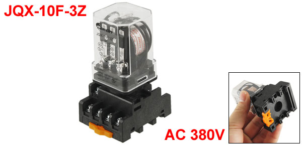Product Name Power Relay w Socket Model No. JQX-10F-3Z Coil Voltage AC 380V Contact Capacity AC 220V 10A/ DC 24V 10A Type 3PDT Number of Pins 11 Overall Size (Approx.) 51 x 43 x 81mm/ 2" x 1.7" x 3.3" (L*W*H) Shell Material Plastic Main Color Black, Clear Weight 120g Package Content 1 x Power Relay w Socket - Reviews