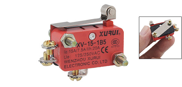 Product Name Micro Switch Model No. XV-15-1B5 Actuator Type Roller Hinge Lever Rating Ue: AC125/250V, Ie: 15A/7.5A, Ith: 20A Contact configuration SPDT Switch Body Size ~2.8 x 1.68 x 1cm / 1.1 x 0.66 x 0.39"(L*W*H) Fixing Screw Dia. ~0.28cm / 0.11“ Button Height ~0.2cm / 0.13" Actuator Size ~2.57 x 0.48cm / 1 x 0.19"(L*W) Terminal Blade Width ~0.33cm / 0.13" Material Plastic & Metal Color Red, Black & Silver Tone Net Weight 13g Package Content 1 x Micro Switch - Reviews