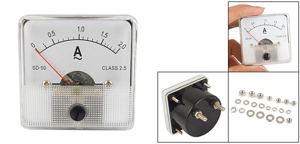 Product Name Analog Ammeter Model SD-50 Measuring Range AC 0-2A Accuracy Class 2.5 Meter Face Size(Approx) 5 x 5 x 1cm / 2" x 2" x 0.39"(L*W*T) Thread Size 0.28 x 0.8cm / 0.11" x 0.3"(D*L) 0.38x 0.9cm / 0.15" x 0.35"(D*L) Overall Depth 3.3cm/1.3" Color Black, Clear Net Weight 74g Package Content 1 x Analog Ammeter Several Installing Parts - Reviews