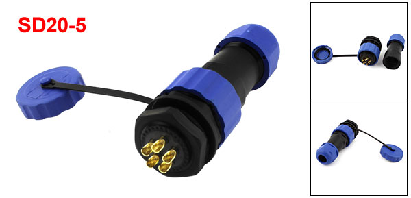 Product Name Waterproof Aviation Connector Model SD20-5 Waterproof Level IP68 Rated Current / Voltage AC 500V/30A Withstand Voltage AC 1500V Panel Cutout Diameter 20mm Cable Range 7-11mm Terminals 5 Pins Total Size 28 x 85mm / 1.1" x 3.3" (D*L) Material Plastic, Brass Color Blue, Black, Gold Tone Weight 44g Package Content 1 x Waterproof Aviation Connector - Reviews