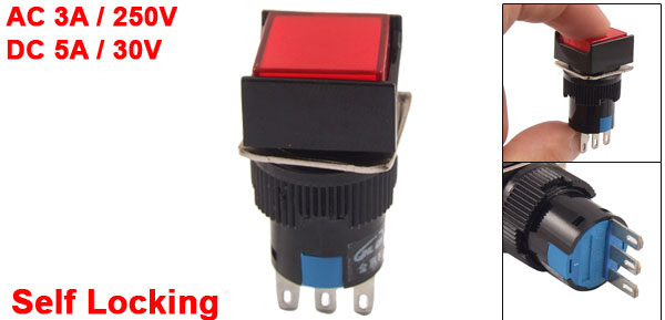 Product Name Push Button Switch Action Type Self Locking Contact Type 1 NO, 1NC Rating Voltage AC 3A / 250V DC 5A / 30V Terminals Quanlity 3 Pins Mounting Hole Diameter 15.5mm / 0.6" Button Size 15 x 15mm / 0.6" x 0.6"(L*W) Terminals Pitch 5mm / 0.2" Overall Size 18 x 18 x 39mm / 0.71" x 0.71" x 1.5"(L*W*H) Material Plastic & Metal Color Red & Black Weight 8g Package Content 1 x Push Button Switch - Reviews