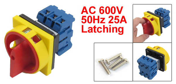 Product Name Changeover Switch Model No. SZD11-25A Action Type Latching Rated Voltage AC 600V 50Hz Rated Current 25A Positions 2(ON-OFF) Terminal Number 6 Suitable Board(Max.) 5mm/ 0.197"(Adjustable) Thread Hole Distance 48mm/ 1.89"(Center to Center) Screw Size 19 x 3.8mm/ 0.75" x 0.15"(L*Dia) Body Size 57 x 43mm/ 2.24" x 1.69"(L*W) Overall Size 64 x 64 x 94mm / 2.52" x 2.52" x 3.7"(L*W*H) External Material Plastic Net Weight 159g Package Content 1 x Changeover Switch