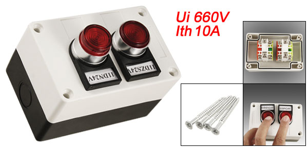 Product Name Push Button Station Ui 660V Ith 10A IEC 337 Lamp Voltage 24V Material Plastic, Metal Overall Size(not include the button) 10.8 x 7 x 6.3cm/4.2'' x 2.7'' x 2.5'' (L*W*H) Overall Height 8.6cm / 3.4" Color As Picture Shown Net Weight 236g Package Content 1 x Push Button Station - Reviews