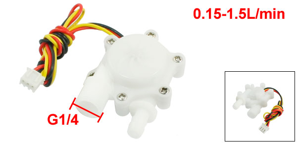Product Name Water Flow Sensor Model SEN-HW06FA Flow Range 0.15-1.5L/min Working Voltage & Current DC3V-18V, 10mA Rated Voltage DC5V Pulse Duty Factor 50 % High Level of Pulse Output >4.5V Low Level of Pulse Output <0.5V Max Pressure 0.8Mpa Insulation Performance(Min.) 100MΩ Connector Type 3Pin JST Connector Main Material POM Total Size 54 x 40 x 23mm / 2.1" x 1.6" x 0.91"(L*W*T) Inlet Outer Diameter G1/4 Outlet Outer Diameter 6mm Cable Length 33cm / 13" Body Color White Weight 27g Package Content 1 x Water Flow Sensor - Reviews