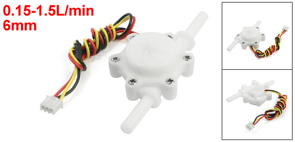 Product Name Water Flow Sensor Model SEN-HZ06K Flow Range 0.15-1.5L/min Working Voltage & Current DC3V-18V, 10mA Rated Voltage DC5V Pulse Duty Factor 50 % High Level of Pulse Output >4.5V Low Level of Pulse Output <0.5V Max Pressure 0.8Mpa Insulation Performance(Min.) 100MΩ Connector Type 3Pin JST Connector Main Material POM Total Size 86 x 41 x 22mm / 3.4" x 1.6" x 0.87"(L*W*T) Outlet=Inlet Outer Diameter 6mm/0.24" Cable Length 33cm / 13" Body Color White Weight 28g Package Content 1 x Water Flow Sensor - Reviews