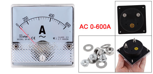 DetailsSF-80 AC 0-600A Rectangle Analog Panel Ammeter Gauge  Product Name Analog Ammeter Model SF-80 Measuring Ampere Range AC 0-600A Accuracy Class 2.5 Meter Face Size(Approx) 8 x 8 x 3.5cm / 3.1" x 3.1" x 1.4"(L*W*T) Thread Size 4 x 8mm / 0.2" x 0.31"(D*L) Color White, Black Net Weight 102g Package Content 1 x Analog Ammeter