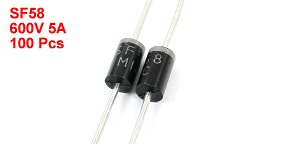 Product Name Super Fast Recovery Diodes Model SF58 Max Repetitive Peak Reverse Voltage 600V Average Forward Current 5A Lead Size(Each Side) 1 x 25mm/0.04" x 1"(D*L) Body Dimension 5 x 9mm/0.2" x 0.35"(D*L) Color As Picture Shown Weight 104g Package Content 100Pcs(±2%)x Super Fast Recovery Diodes - Reviews