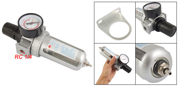 Product Name Air Source Treatment Model Number SFR200 Working Medium Air Adapter Diameter RC 1/4 (11.6mm) Pressure Gauge Connector Dia RC 1/8 (7.7mm / 0.3") Pressure Gauge Range 0-150 kg/cm² Filter Precision 40µ Proof Pressure 1.5Mpa Max Ajustable Pressure 1.0Mpa Range of Temperature Applied 5-60°C Size 6 x 21.5cm / 2.4" x 8.5" (D*L) Color Silver Tone Weight 503g Package Content 1 x Air Source Treatment