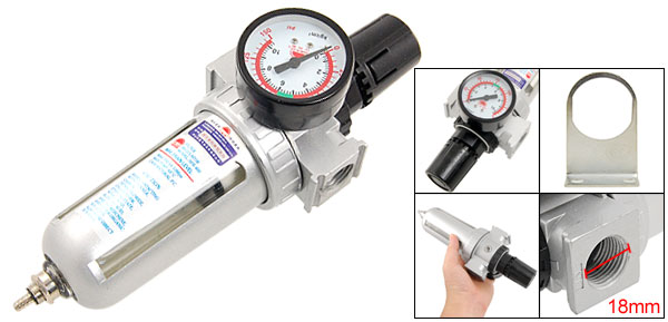 Product Name Air Source Treatment Model Number SFR400 Working Medium Air Adapter Diameter 18mm/ 0.708" Pressure Gauge Connector Dia 9mm / 0.354" Pressure Gauge Range 0-150 kg/cm² Filter Precision 40µ Proof Pressure 1.5Mpa Max. Ajustable Pressure 1.0Mpa Max.Temperature 60°C Size 6 x 22.5cm / 2.4" x 8.6" (D*L) Color Silver Tone, Black Weight 531g Package Content 1 x Air Source Treatment
