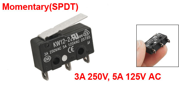 Product Name Micro Switch Model No. KW12-2 Contact Type Momentary(SPDT) Actuator Type Short Lever Rated Load 3A 250V, 5A 125V AC Switch Body Size(Each) 2 x 1.3 x 0.6cm / 0.78" x 0.5" x 0.2" (L*W*H) Holes Dia. 0.27cm / 0.11" (Approx) Lever Size 1.7 x 0.4cm/0.67" x 0.15"(L*W) Material Plastic & Metal Color Black & Silver Tone Net Weight 3g Package Content 1 x Micro Switch - Reviews
