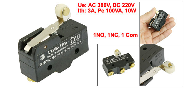 Product Name Micro Switch Model No. LXW5-11G2 Contact Type 1NO, 1NC, 1 Com Mounting Type Panel Mount Termination Style Screw Terminal Actuator Type Short Hinge Roller Lever Rating Ue: AC 380V, DC 220V