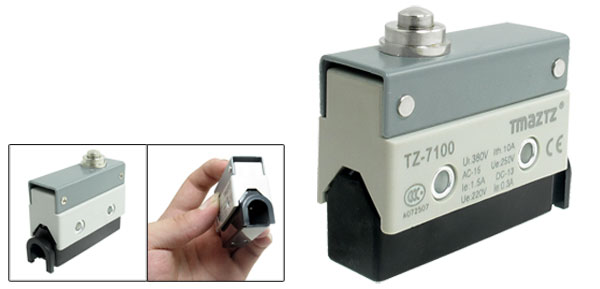 Product Name Limit Switch Model No. TZ-7100 Conact Configuration 1NO,1NC(SPDT) Actuator Action Momentary Actuator Type Short Push Plunger Ui 380V Ith 10A AC-15 Ue: 250V, le: 1.5A DC-13 Ue: 220V, le: 0.3A Switch Body Size ~5.3 x 2.1 x 4cm / 2.1 x 0.8 x 1.6"(L*W*H) Fixing Holes Dia. ~0.44cm / 0.17" Distance Between Centers of Fixing Holes ~2.5cm / 0.98" Actuator Size 1.3 x 0.8cm / 0.5" x 0.3"(Max.D*L) Color Grey, Black Net Weight 64g Package Content 1 x Limit Switch - Reviews