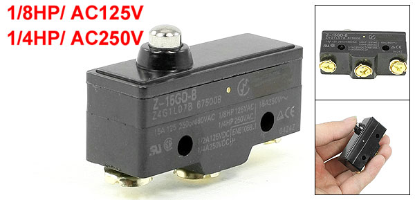 Product Name Limit Switch Model No. Z-15GD-B Terminal Style 3 Screw Terminal Actuator Type Long Straight Hinge Lever , Automatic Reset Rating & Voltage AC125/ 250V/ 480V, 15A Power 1/8HP/ AC125V, 1/4HP/ AC250V Roller Dia. 12.5 x 4.5mm/ 0.5" x 0.14"(D*T) Fixing Holes Dia. 0.4cm / 0.16“ Hole Center Point Distance 2.5cm / 0.98" Switch Body Size 5 x 1.8 x 2.8cm / 1.97 x 0.7 x 1.1"(L*W*H) Body Main Color Black Net Weight 29g Package Content 1 x Limit Switch - Reviews