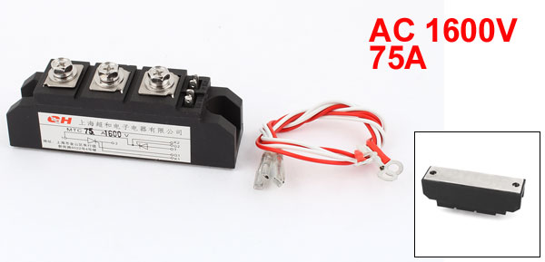 Product Name Thyristor Module Model MTC-75A Max. Average Forward Current 75A Max. Working Peak Reverse Voltage AC 1600V Terminals 3 Mount Hole Diameter 6.5mm/ 0.26" Mount Hole Distance 80mm/ 3.15"(Center to Center) Total Size 95 x 34 x 25mm/ 3.74" x 1.34" x 0.98" (L*W*H) Material Metal, Plastic Color Black, Silver Tone Net Weight 156g Package Content 1 x Rectifier Module