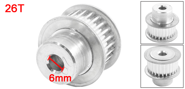 Product Name Timing Pulley Tooth Number 26T Pitch 3mm /0.12" Bore Diameter 6mm /0.24" Bore Outside Diameter 17mm /0.67" Fit Belt Width 11 mm /0.43" Overall Size 28 x 25mm /1.1" x 1" (D*H) Material Aluminum Alloy Color Silver Tone Weight 27g Package Content 1 x Timing Pulley - Reviews