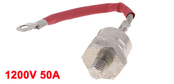 Product Name Rectifier Diode Model ZP50A Average Forward Current 50A Repetitive Peak Reverse Voltage(VRRM) 1200V Thread Diameter 11mm / 0.43" Main Body Size 3 x 4cm/ 1.2" x 1.6" (D*H) Overall Height 18cm / 7.1" Material Metal, Ceramic, Rubber Color Red, Silver Tone Net Weight 85g Package Content 1 x Rectifier Diode  - Reviews