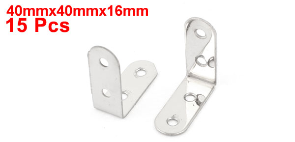 Product Name Angle Bracket Material Metal Color Silver Tone Hole Quantity 4 Holes Total Size 40 x 40 x 16mm/1.6" x 1.6" x 0.6"(L*W*H) Hole Dia. 5mm / 0.2" Hole Distance 18mm/0.7" Net Weight 169g Package Content 15 x Angle Brackets - Reviews