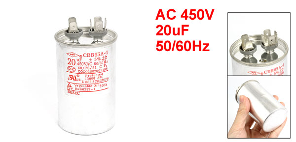 Product Name Motor Capacitor Material Polypropylene Model CBB65A-1 Capacitance 20uF Rated Voltage AC 450V Tolerance ±5% Frequency 50/ 60Hz Operating Temperature 40/70/21 Body Dimension 8 x 5cm/ 3.1" x 1.9"(H*D) Total Length 9cm/ 3.5" Color Silver Tone Weight 162g Package Content 1 x Motor Capacitor - Reviews