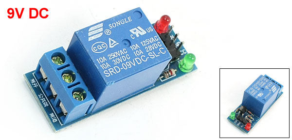 Product Name Relay Module Model SRD-09VDC-SL-C Material Electronic Parts Number of Channels 1 Voltage 9V DC Load 10A, AC 250V/125V, DC 30V/28V Size 43 x 17 x 18mm/ 1.7" x 0.67" x 0.7" (L*W*H) Color Blue Weight 21g Package 1 x Relay Module - Reviews