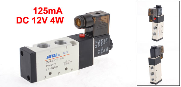 Product Name Pneumatic Solenoid Valve Model 4V310-10 Operation Type Inside Pilot Type Type 5 Way 2 Position Voltage DC 12V 4W Amp 125mA Voltage Range DC 19.2V-26.4V Operating Pressure 0.15 - 0.8 MPa Hex Inner Dia. 12mm/ 0.47" Connect Port Diameter 15mm/ 0.59"