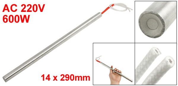 DetailsSingle End 220 Volt 600 Watt Power Heating Cartridge Heater 14mm x 290mm  Product Name Cartridge Heater Material Stainless Steel, PVC, Nylon Rated Voltage AC 220V Power 600W Heater Size (Approx.) 14 x 290mm/ 0.55'' x 11.4" (D * L) Wire Length (Approx.) 290mm/ 11.4'' Color White, Red, Silver Tone Weight 192g Package Content 1 x Cartridge Heater