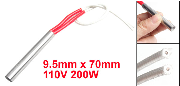 Product Name Cartridge Heater Material Stainless Steel, PVC, Nylon Rated Voltage AC 110V Power 200W Heater Size (Approx.) 9.5 x 70mm / 3/8" x 2.76" (D * L ) Wire Length(Approx.) 26cm / 10.2" Color Silver Tone, White Weight 29g Package Content 1 x Cartridge Heater - Reviews