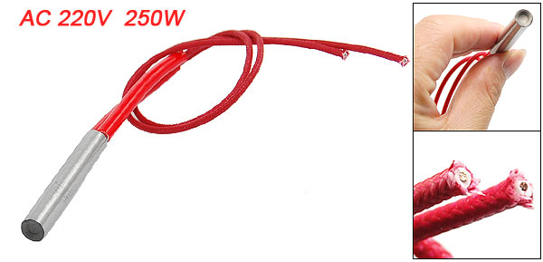 Product Name Cartridge Heater Material Stainless Steel, PVC, Nylon Rated Voltage AC 220V Power 250W Heater Size (Approx.) 8 x 50mm / 0.31" x 2" (D * L) Wire Length (Approx.) 25cm / 10.6" Color Red, Silver Tone Weight 20g Package Content 1 x Cartridge Heater - Reviews