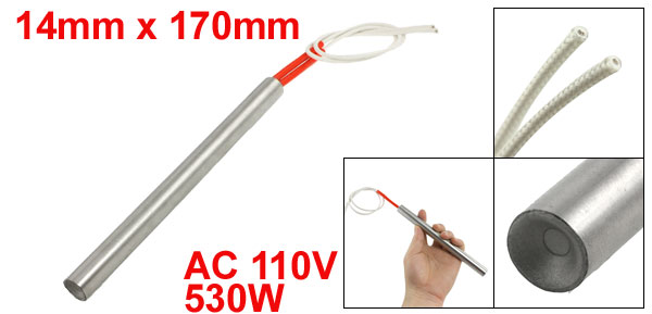 Product Name Cartridge Heater Material Stainless Steel, PVC, Nylon Rated Voltage AC 110V Power 530W Heater Size (Approx.) 14 x 170mm / 0.55" x 6.7" (D * L ) Wire Length (Approx.) 29cm / 11.4" Color Silver Tone, Red, White Weight 107g Package Content 1 x Cartridge Heater - Reviews