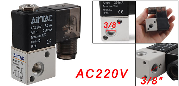 Product Name Solenoid Valve Model 3V1-06 Working Medium Air Working Pressure 0~10kgf/cm2 Max. Pressure Resistance 1.2Mpa Operating Temperature rise 35 degree centigrade Power Consumption AC220V: 6.0VA