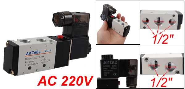 Product Name Solenoid Valve Model 4V210-08 Type 5 Way 2 Position Power Consumption AC 220V 6.0VA Amp 250mA Operating Temperature rise 35°C Operating Pressure 0.15~0.8 Mpa Thread Diameter Inlet=Outlet=1/2" Exhaust=3/8" Total Size (Approx.) 11.8 x 6.5 x 2.2cm / 4.6" x 2.6" x 0.9"(L*W*T) Material Metal, Plastic Color As Picture Shown Weight 219g Package Content 1 x Solenoid Valve - Reviews