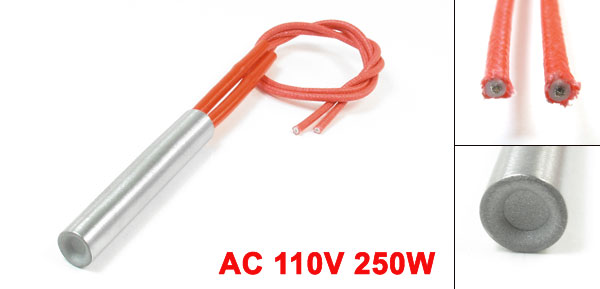 DetailsSingle Head Red Two-wire Cartridge Heater 110V 250W 10mm x 60mm  Product Name Cartridge Heater Material Stainless Steel, PVC, Nylon Rated Voltage AC 110V Power 250W Heater Size (Approx.) 10 x 60mm / 0.39" x 2.4" (D * L ) Wire Length(Approx.) 25.7cm / 10.1" Color Silver Tone, Red Weight 27g Package Content 1 x Cartridge Heater