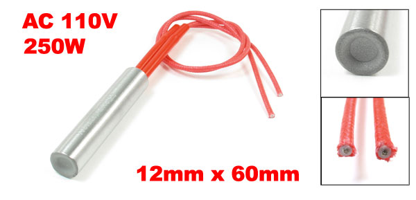 Product Name Cartridge Heater Material Stainless Steel, PVC, Nylon Rated Voltage AC 110V Power 250W Heater Size (Approx.) 12 x 60mm / 0.47" x 2.4" (D * L ) Wire Length(Approx.) 26cm / 10.2" Color Silver Tone, Red Net Weight 36g Package Content 1 x Cartridge Heater - Reviews