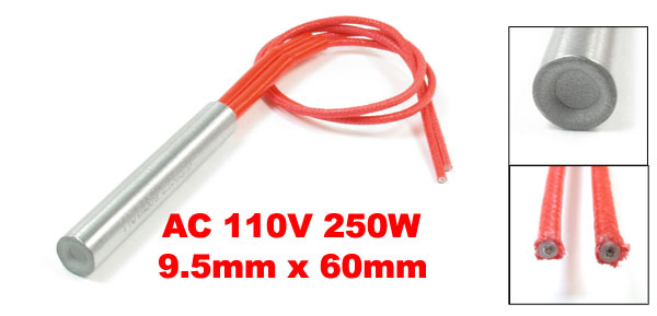 DetailsSingle Head Red Two-wire Cartridge Heater 110V 250W 9.5mm x 60mm  Product Name Cartridge Heater Material Stainless Steel, PVC, Nylon Rated Voltage AC 110V Power 250W Heater Size (Approx.) 9.5 x 60mm / 0.37" x 2.4" (D * L ) Wire Length(Approx.) 26.2cm / 10.3" Color Silver Tone, Red Weight 27g Package Content 1 x Cartridge Heater