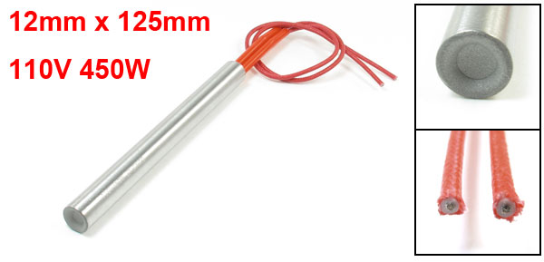 Product Name Cartridge Heater Material Stainless Steel, PVC, Nylon Rated Voltage AC 110V Power 450W Heater Size (Approx.) 12 x 125mm / 0.47" x 4.9" (D * L ) Wire Length(Approx.) 26cm / 10.2" Color Silver Tone, Red Net Weight 67g Package Content 1 x Cartridge Heater - Reviews