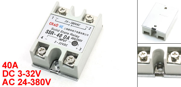 Product Name Solid State Relay Type SSR-40 DA Rated Load Current 40A Input DC 3-32V Output AC 24-380V Total Size (Approx.) 6.3 x 4.5 x 2.3cm/ 2.5" x 1.8" x 0.9"(L*W*T) Material Plastic, Electric Part Color Gray, Silver Tone Weight 116g Package Content 1 x Solid State Relay