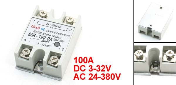 Product Name Solid State Relay Type SSR-100 DA Rated Load Current 100A Input DC 3-32V Output AC 24-380V Total Size (Approx.) 6.3 x 4.5 x 2.3cm/ 2.5" x 1.8" x 0.9"(L*W*T) Material Plastic, Electric Part Color Gray, Silver Tone Weight 116g Package Content 1 x Solid State Relay