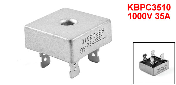 Product Name Bridge Rectifier Model KBPC3510 Max. Average Forward Rectified Current 35A Max. Recurrent Peak Reverse Voltage 1000V Max. RMS Bridge Input Voltage 700V Max. DC Blocking Voltage 1000V Operating Temperature Range -55-125°C Pitch Distance 18mm / 0.7" Terminal Size 6.2 x 16mm / 0.24" x 0.63" (W*L) Dimension 28 x 28 x 11mm / 1.1" x 1.1" x 0.43" (L*W*T) Mounted Hole Dia. 6mm / 0.24" Material Resin, Metal Color Black, Silver Tone Net Weight 24g Package Content 1 x Bridge Rectifier - Reviews