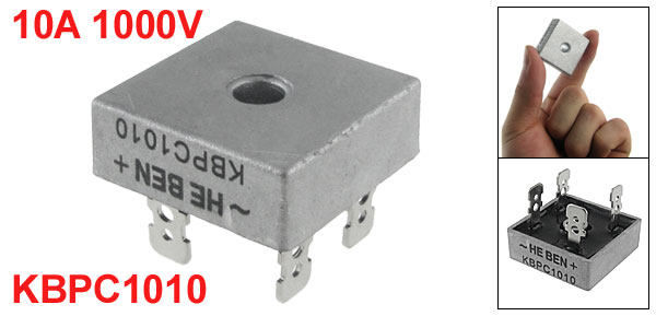 Product Name Single Phase Bridge Rectifier Model No. KBPC1010 Output Current(DC) 10A Repetitive Peak Reverse Voltage(AC) 1000V Repetitive Peak Reverse Current 5mA Insulation Voltage 2500V Fixing Hole Diameter 5mm / 0.2" Overall Size(Approx.) 29 x 29 x 21mm / 1.1" x 1.1" x 0.8"(L*W*H) Material Aluminum, Plastic Net Weight 19g Package Content 1 x Single Phase Bridge Rectifier - Reviews