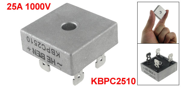 Product Name Single Phase Bridge Rectifier Model No. KBPC2510 Output Current(DC) 25A Repetitive Peak Reverse Voltage(AC) 1000V Repetitive Peak Reverse Current 5mA Insulation Voltage 2500V Fixing Hole Diameter 5mm / 0.2" Overall Size(Approx.) 29 x 29 x 21mm / 1.1" x 1.1" x 0.8"(L*W*H) Material Aluminum, Plastic Net Weight 18g Package Content 1 x Single Phase Bridge Rectifier - Reviews