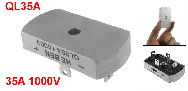 Product Name Single Phase Bridge Rectifier Model No. QL35A Output Current(DC) 35A Repetitive Peak Reverse Voltage(AC) 1000V Repetitive Peak Reverse Current 5mA Insulation Voltage 2500V Fixing Hole Diameter 6mm / 0.24" Overall Size(Approx.) 61 x 32 x 24mm / 2.4" x 1.3" x 0.9" (L*W*H) Material Aluminum, Plastic Net Weight 41g Package Content 1 x Single Phase Bridge Rectifier - Reviews