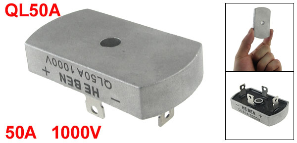 Product Name Single Phase Bridge Rectifier Model No. QL50A Output Current(DC) 50A Repetitive Peak Reverse Voltage(AC) 1000V Repetitive Peak Reverse Current 7mA Insulation Voltage 2500V Fixing Hole Diameter 6mm / 0.24" Overall Size(Approx.) 61 x 32 x 24mm / 2.4" x 1.3" x 0.9" (L*W*H) Material Aluminum, Plastic Net Weight 42g Package Content 1 x Single Phase Bridge Rectifier - Reviews
