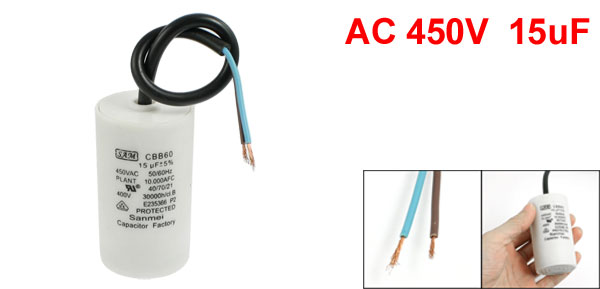 Product Name Motor Capacitor Model CBB60 Material(External) Plastic Rated Capacitance 15uF Tolerance ±5% Rated Frequency 50/60Hz Rated Voltage AC 450V Size 7 x 3.8cm / 2.8" x 1.5" (L * D) Cable Length 20cm / 7.9" Main Color White Weight 85g Package Content 1 x Motor Capacitor - Reviews