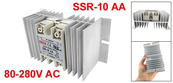 DetailsSingle Phase Solid State Relay SSR 10A 24-380V DC 80-280V AC w Aluminum heatsink  Product Name Solid State Relay + Heat Sink Model No. SSR-10 AA Load Current 10A Load Voltage 24-380V AC Control Voltage 80-280V AC Mounting Hole Diameter 5mm / 0.2" Total Size (Approx.) 126 x 70 x 52mm / 5.0" x 2.8" x 2.0" (L*W*H) Heatsink Material Aluminum Weight 282g Package Content 1 x Solid State Relay + Heat Sink