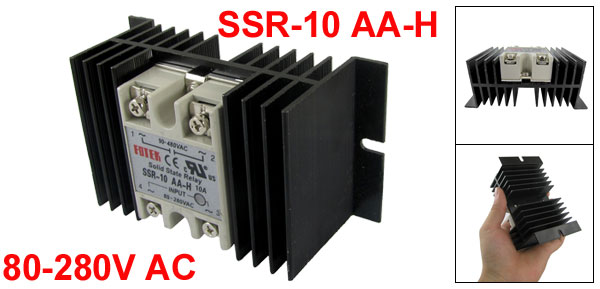 Product Name Solid State Relay + Heat Sink Model No. SSR-10 AA-H Material Metal, Aluminum, Plastic Load Current 10A Load Voltage 90-480V AC Control Voltage 80-280V AC Total Size (Approx.) 126 x 70 x 52mm / 5.0" x 2.8" x 2.0" (L*W*H) Weight 319g Package Content 1 x Solid State Relay + Heat Sink - Reviews