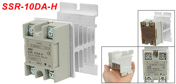 Product Name Solid State Relay w Heat Sink Type SSR-10DA-H Material Relay: Metal, Plastic, Electric Parts Heat Sink: Aluminum Rated Load Current 10A Input DC 4-32V Output AC 75-480V Relay Size 5.7 x 4.4 x 2.5cm / 2.2" x 1.7" x 1" (L*W*T) Heat Sink Size 8.1 x 4.9 x 5cm/ 3.1" x 1.9" x 2"(L*W*H) Total Size 8.1 x 5 x 7.6cm/ 3.1" x 2" x 3"(L*W*H) Main Color Silver Tone, Gray Weight 197g Package Content 1 x Solid State Relay