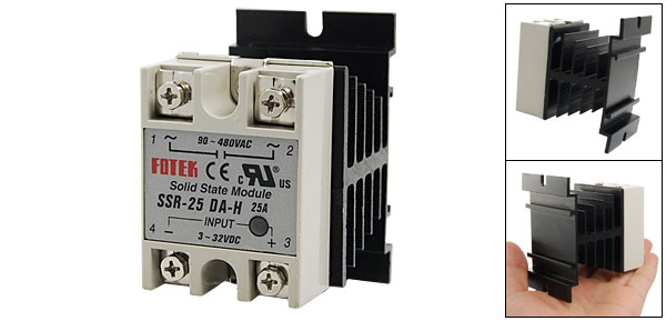 Product Name Solid State Relay + Heat Sink Type SSR-25DA-H Material Relay: Metal, Plastic, Electric Parts Heat Sink: Aluminum Rated Load Current 25A Input DC 3-32V Output AC 90--480V Relay Size 6 x 4.5 x 2.2cm / 2.3" x 1.7" x 0.8" (L*W*H) Heat Sink Size 8.1 x 5 x 4.2cm/ 3.1" x 2" x 1.6"(L*W*H) Total Size 8.1 x 5 x 7.2cm/ 3.1" x 2" x 2.8"(L*W*H) Main Color Black, Gray Weight 205g Package Content 1 x Solid State Relay, 1 x Heat Sink - Reviews