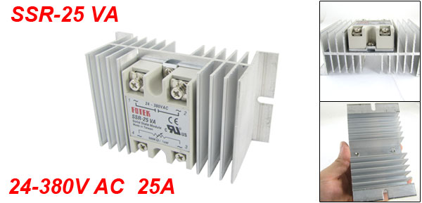 Product Name Solid State Relay + Heat Sink Model No. SSR-25 VA Load Current 25A Load Voltage 24-380V AC Potentiometer Input Resistance & Power 500KΩ, 1/4W(Potentiometer is not included) Mounting Hole Diameter 5mm / 0.2" Total Size (Approx.) 126 x 70 x 52mm / 5.0" x 2.8" x 2.0" (L*W*H) Heatsink Material Aluminum Color Silver Tone Weight 282g Package Content 1 x Solid State Relay + Heat Sink - Reviews